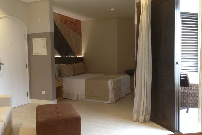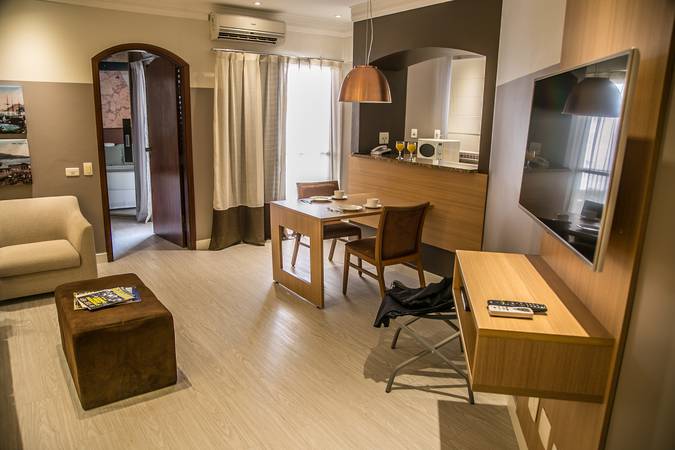 Composto por uma suíte elegante com cama de casal, uma espaçosa sala de estar, cozinha totalmente equipada e uma sacada para apreciar a vista.