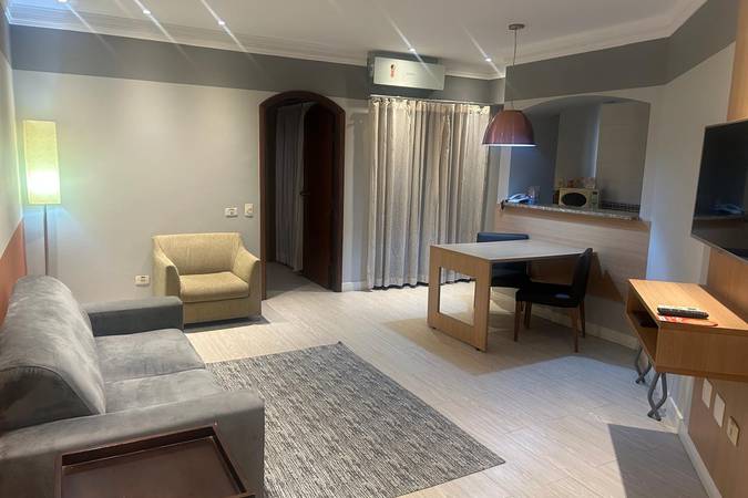Composto por uma suíte elegante com cama de casal, uma espaçosa sala de estar, cozinha totalmente equipada e uma sacada para apreciar a vista.